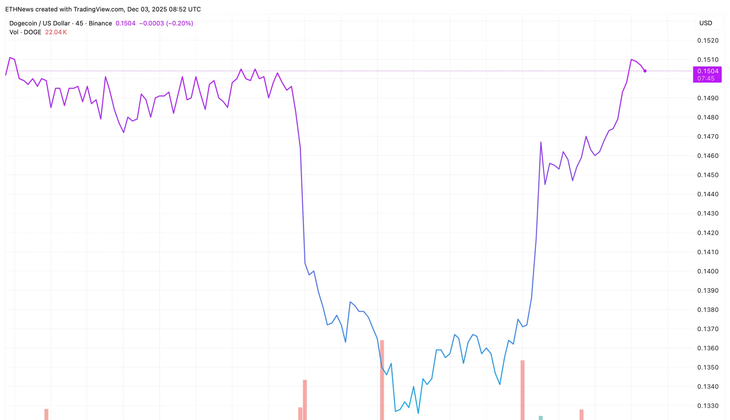 Source: ETHNews Original Title: Dogecoin Signals Potential Trend Reversal With Double Bottom Setup Original Link: Dogecoin is showing early signs of a recovery after a sharp December drop, with fresh chart data highlighting a potential trend reversal in progress. The price briefly collapsed below $0.1320 before rebounding with strong momentum, returning to the $0.1500 region as buyers stepped back in.