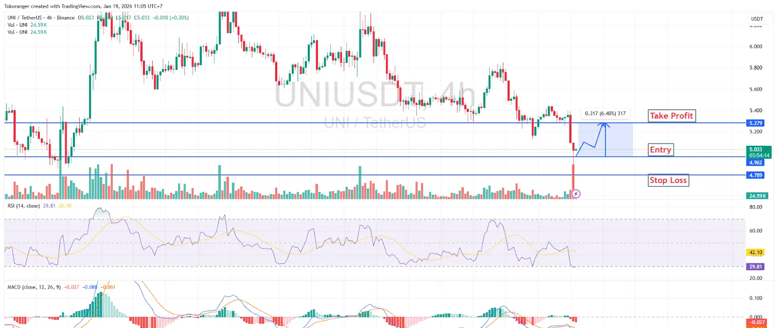 Although the main trend remains bearish, short-term rebound opportunities still exist and can be exploited technically, with entry at 4.962, stop loss at 4.789, and take profit at 5.279, while maintaining discipline due to ongoing downside risk.