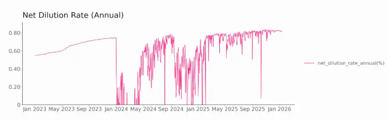 Annualized net dilution rate increased to 0.83%, a new high since 2024, exerting downward pressure on price.