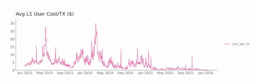 Average transaction costs on L1 dropped sharply after March 2025 to near zero.