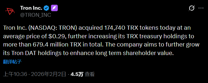 Deep Tide TechFlow News, February 3rd, according to an official announcement, the U.S. publicly traded company Tron Inc. (NASDAQ: TRON) today purchased 174,740 TRX tokens at an average price of $0.29, further increasing its TRX holdings to over 679.4 million tokens. The company stated that it plans to continue increasing its TRX DAT holdings to enhance long-term shareholder value.