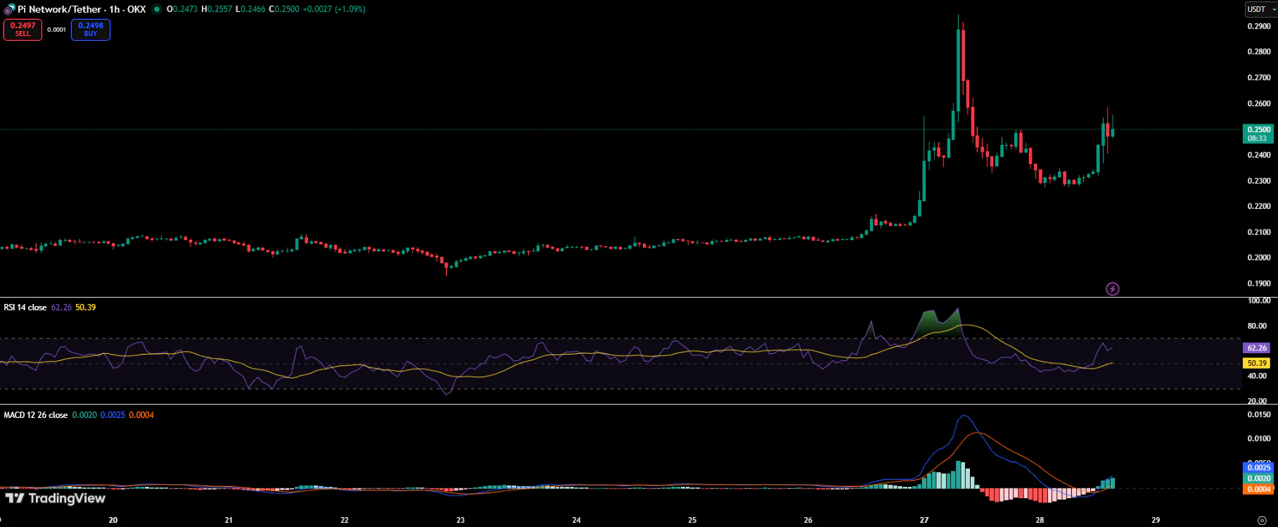 1-годинний графік підтвердив прорив. Після певного часу консолідації ціна Pi зросла вище 0,25 долара при зростанні обсягу торгів і підтримці RSI вище 60. Гістограма MACD також стала позитивною, що свідчить про те, що покупці знову взяли під контроль ринок, а імпульс постійно посилюється. Підтвердження на короткострокових графіках є дуже важливим для прогнозування ціни Pi Network, оскільки це показує, що прорив не є хибним, а є справжнім проривом, що отримав реальну підтримку з боку покупців.