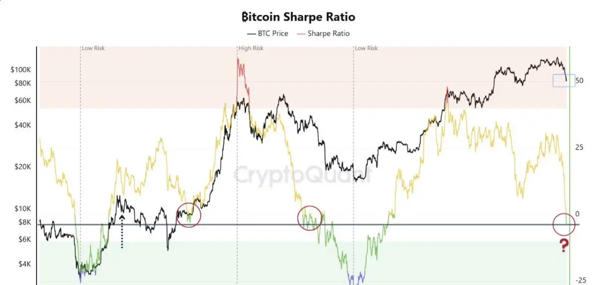 Графік ілюструє, що коефіцієнт Шарпа Bitcoin тепер досяг тієї ж зони, що спостерігалась під час кількох основних переломних моментів. Перший випадок стався в березні 2020 року під час краху COVID, коли страх і волатильність переповнили ринок перед вибуховим багаторічним бичачим трендом. Другий з'явився в середині 2022 року після краху Luna та Three Arrows Capital, момент, позначений панічними продажами та широким ризиком ліквідації. У кожному з цих циклів обвал коефіцієнта Шарпа збігався з глибоким стресом на ринку, але також і з умовами, які пізніше призвели до сильного зростання.