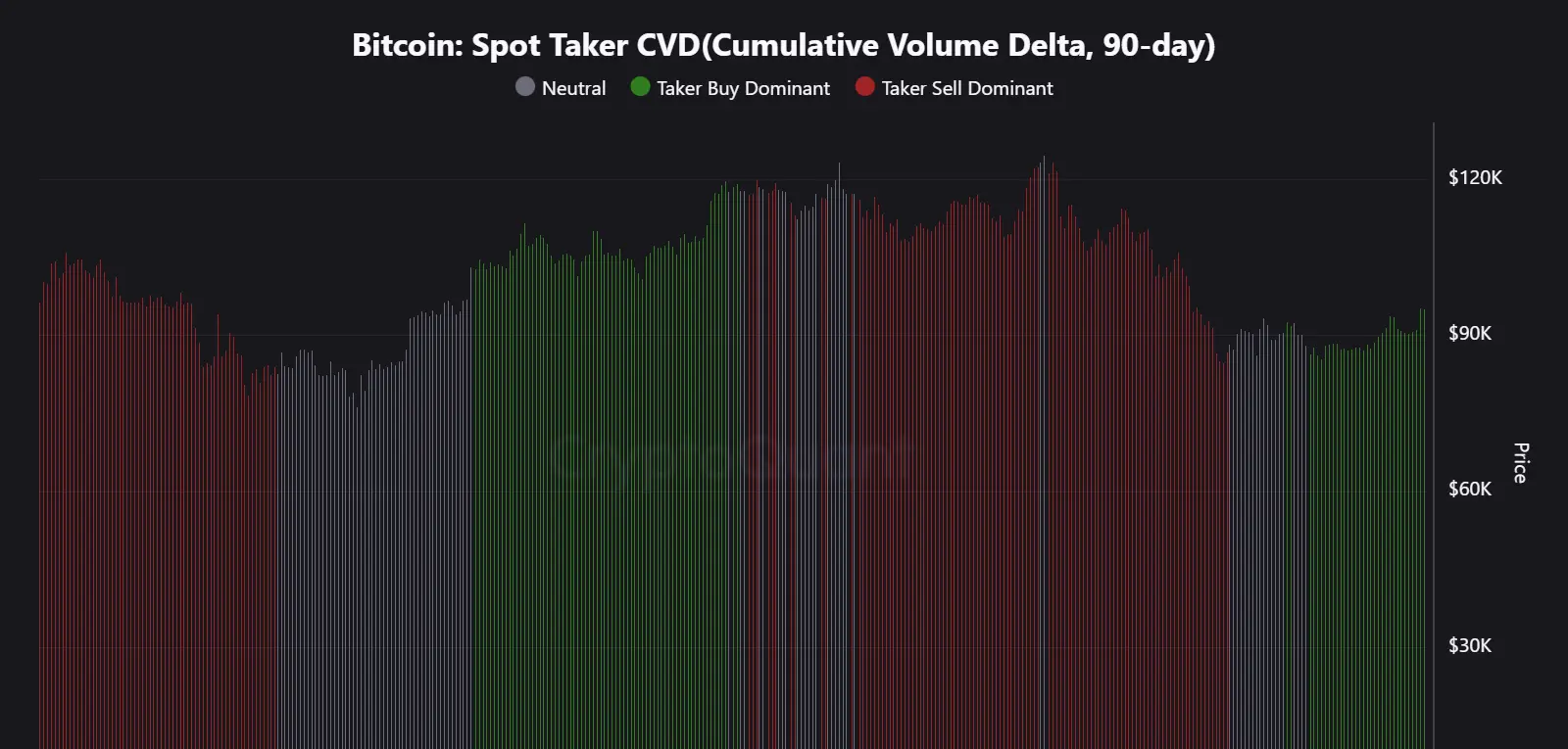 Ончейн-індикатори підтверджують цю історію сили, що веде зростання. 90-денний Spot Taker CVD почав ставати позитивним приблизно при $86 000, сигналізуючи про зростання домінування покупців Taker. Ця метрика показує, що обсяг покупок на ринку постійно переважав обсяг продажів ще до досягнення цінових максимумів.