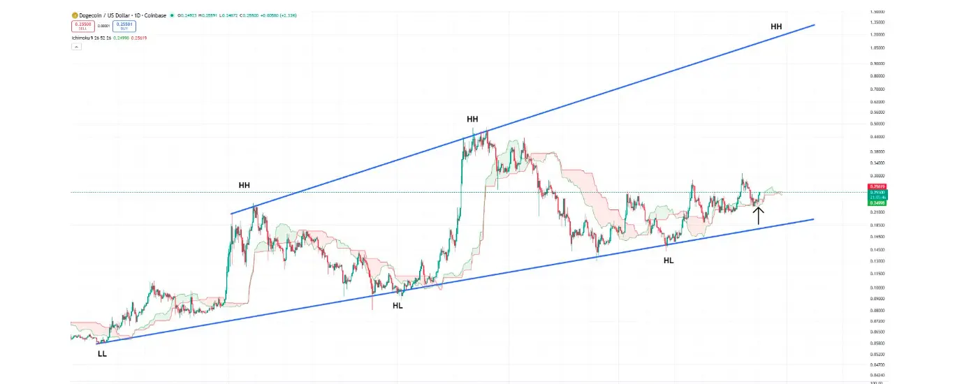 Đối với những người chưa quen, mô hình loa phóng đại tăng dần có các đường xu hướng phân kỳ, ghi lại cả các đáy tăng và các đỉnh mở rộng. Trong trường hợp của Dogecoin, cấu trúc này cho thấy một quỹ đạo đi lên bắt đầu từ giữa năm 2023 và tiếp tục đến năm 2025.