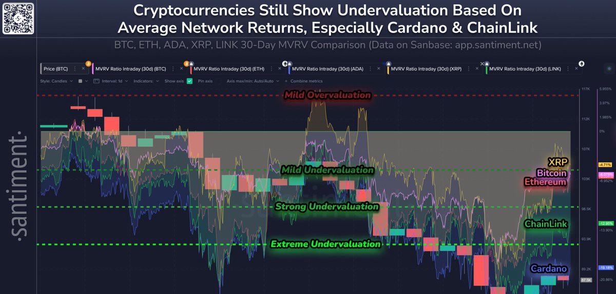 Nguồn: ETHNews Tiêu đề gốc: Cardano và Chainlink Flash Định giá thấp nghiêm trọng khi thị trường tiếp tục thua lỗ, Santiment cho biết Liên kết gốc: Dữ liệu mới từ Santiment cho thấy mặc dù có một đợt phục hồi ngắn vào đầu tuần, các loại tiền điện tử lớn vẫn đang chịu tổn thất đáng kể ở cả ngắn hạn và trung hạn, với các ví trung bình trên nhiều mạng hàng đầu đang ở mức lỗ sâu trong 30 ngày qua. Các chỉ số dựa trên MVRV mới nhất của công ty nhấn mạnh các vùng định giá rõ ràng bị định giá thấp trên thị trường, đặc biệt là đối với Cardano và Chainlink.