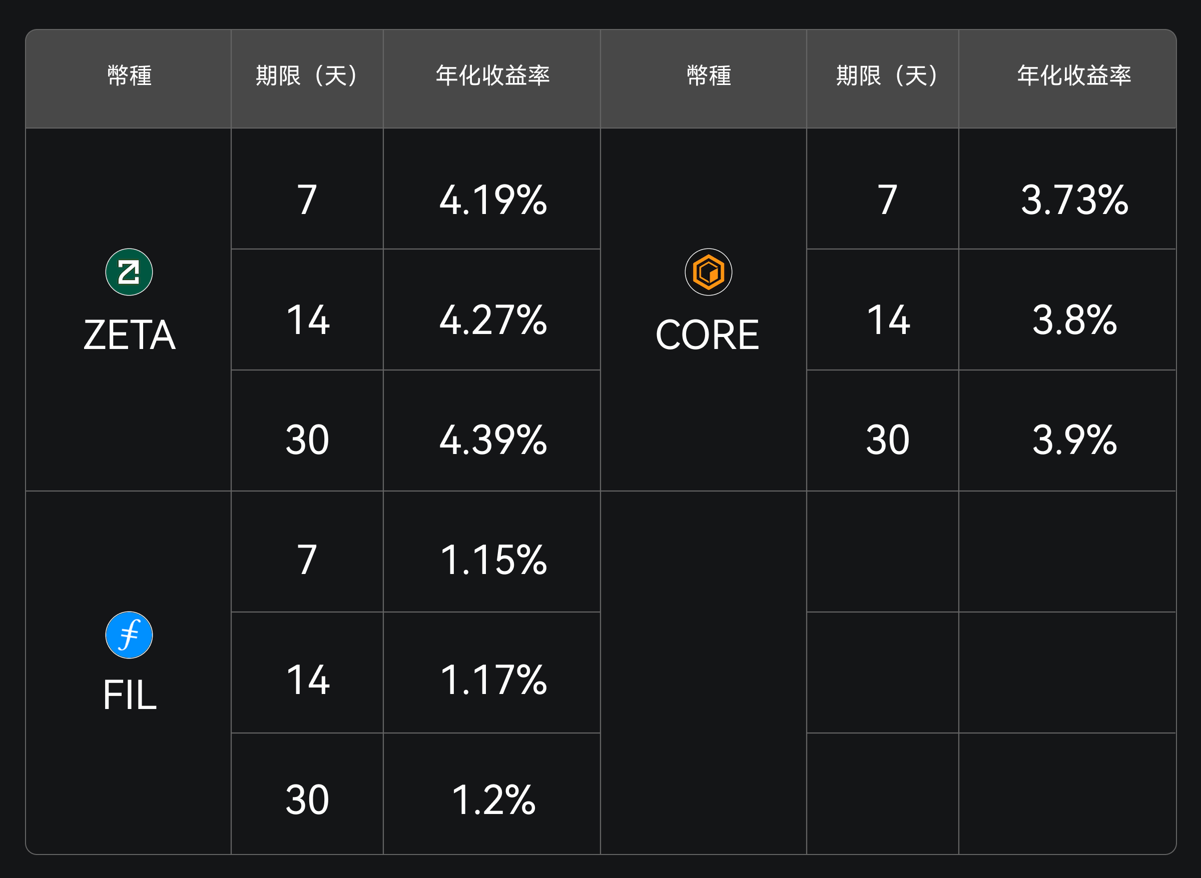 Gate 餘幣寶現已上線 ZETA、CORE、FIL 定期理財,提供 7 天、14 天、30 天三種鎖倉週期,歡迎前往參與申購。