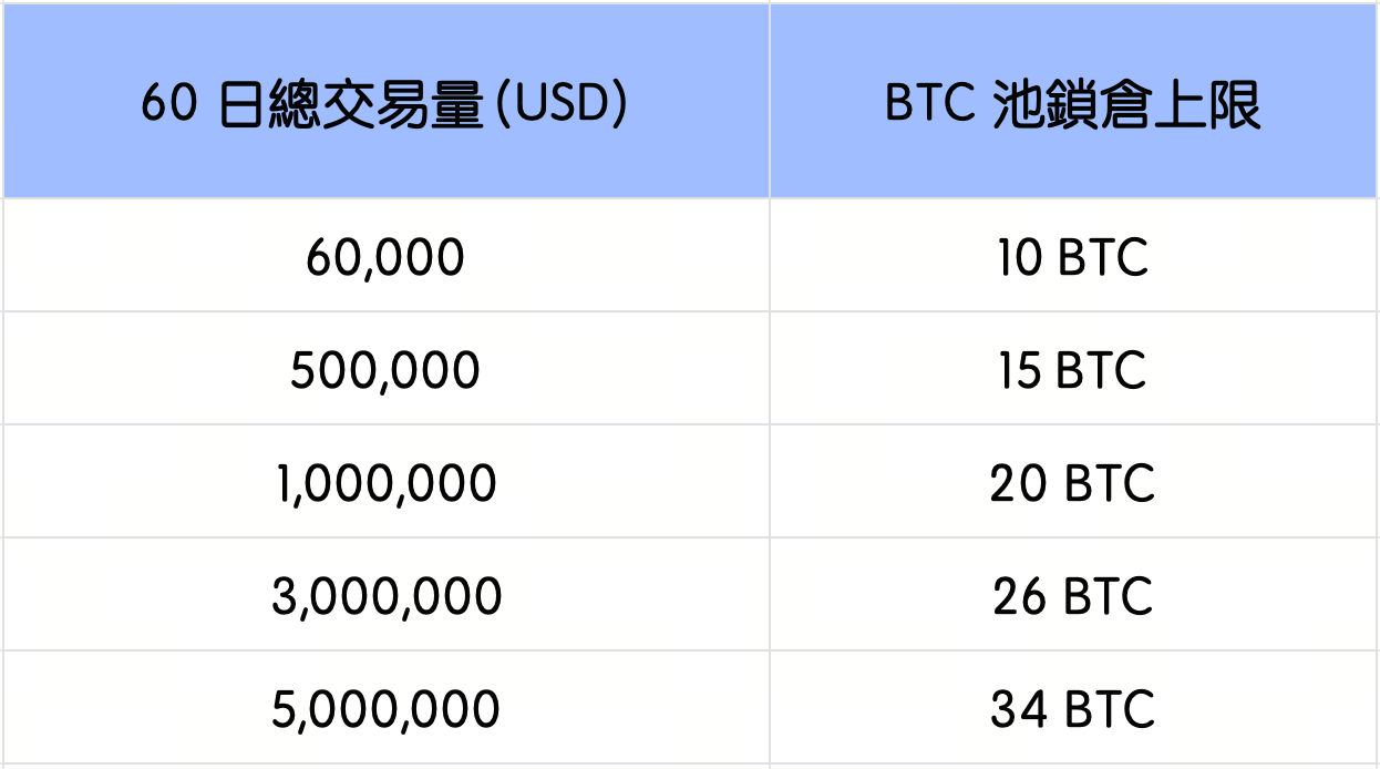將根據 60 日總交易量確定鎖倉上限。達到更高的交易量,即可解鎖更高的質押額度。
