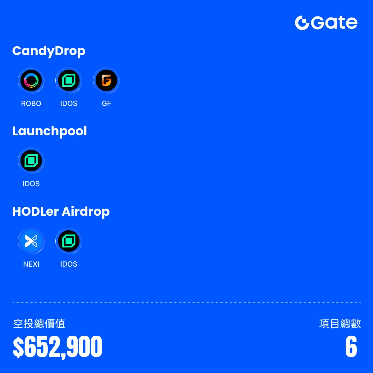 本週期 Gate 上線了 5 個新項目,3 個 CandyDrop 項目,1 個 Gate Launchpool 項目,2 個 HODLer Airdrop 項目,累計空投總價值為 $652,900。
