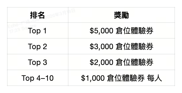 活動期間將上線「廣場跟單交易員卡片排行榜」,排名將綜合發帖活躍度、用戶互動及跟單表現進行評選。排行榜前 10 名交易員可瓜分專項獎勵: