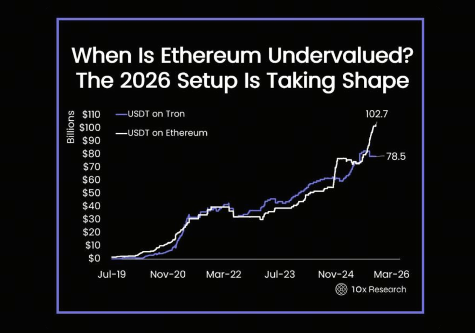 雖然 ETH 近期價格波動不大,鏈上流動性卻呈現截然不同的景象。10x Research 報告指出,自川普當選以來,Ethereum 上的 USDT(Tether)供應量已從 540 億美元成長至超過 1,020 億美元,幾乎翻倍,這部分資金悄悄流入以太坊生態系統,但市場焦點尚未完全捕捉。