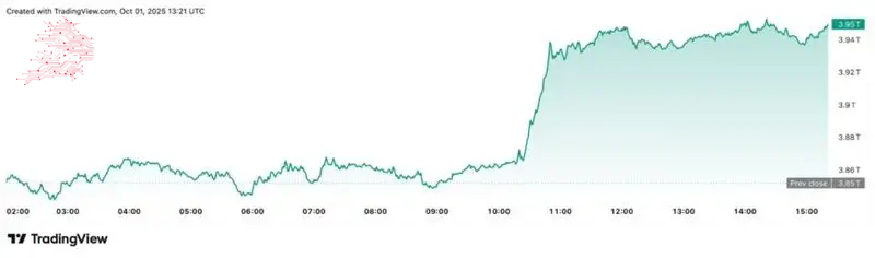 不久之後,該數字進一步攀升,按 TradingView 提供的數據,截至發稿時,市值約爲 $3.95 萬億。