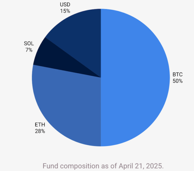 MI4基金所構成的標的包括比特幣、以太坊、索拉納、美元穩定幣等虛擬貨幣。根據市值和風險決定構成配比,每季度進行審查,旨在提供對市值較高的虛擬貨幣的敞口。