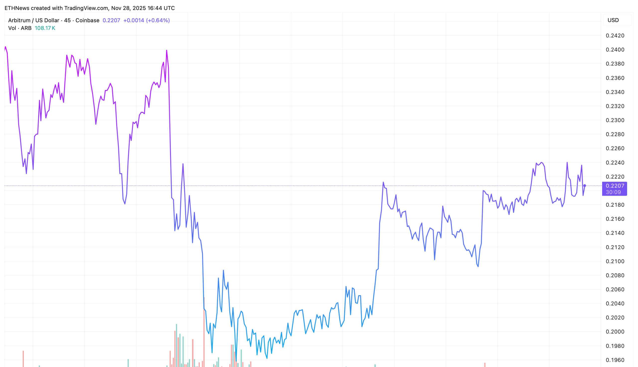 Arbitrum 在 11 月 19 日至 21 日之間經歷了一次急劇下跌後,交易價格接近 $0.2207,隨後隨着買家開始重新入場,逐漸恢復。每一次漲都得到了交易量上升的支持,盡管市場情緒仍然脆弱,但這表明早期的積累。