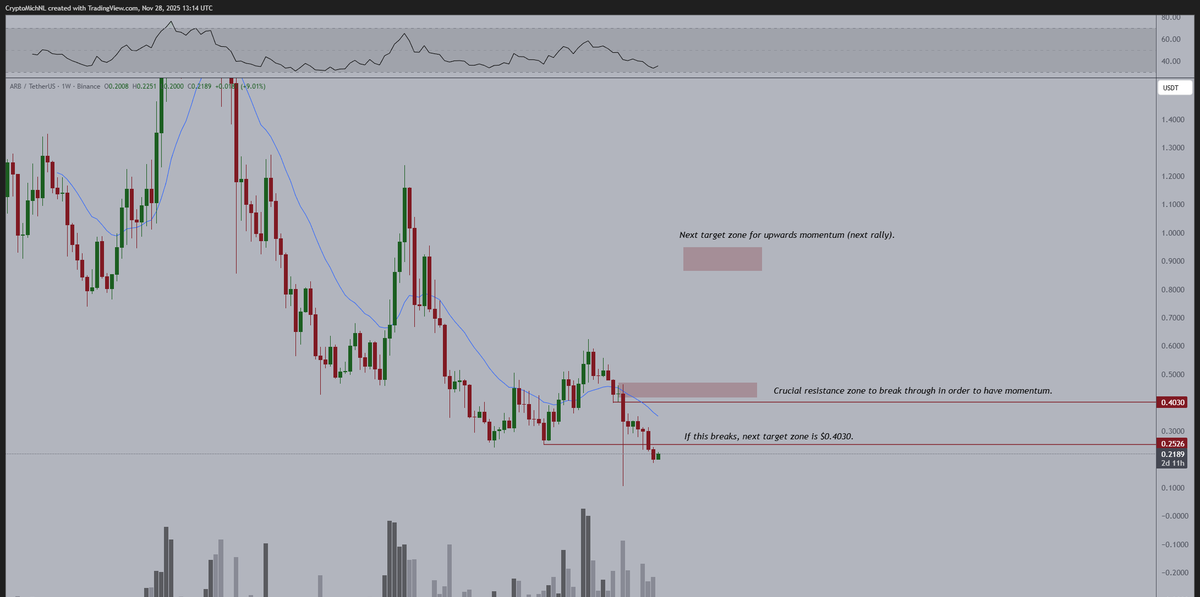 根據技術分析,關鍵關注水平是0.25美元區間。圖表顯示Arbitrum在幾個月內不斷下跌,反復失去支撐,隨後在當前水平附近形成了一個壓縮基礎。
