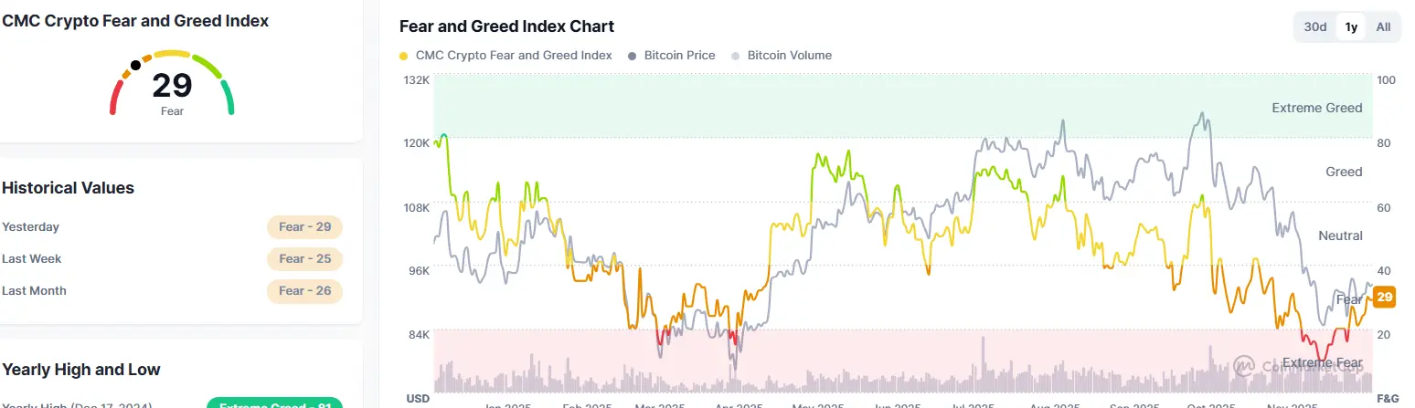 加密投資者情緒在11月23日錄得的“極端恐懼”水平10之後略有回升,但目前的29仍然顯示“恐懼”,遠低於10月7日發生$19 十億美元加密市場所出現的62“貪婪”水平。
