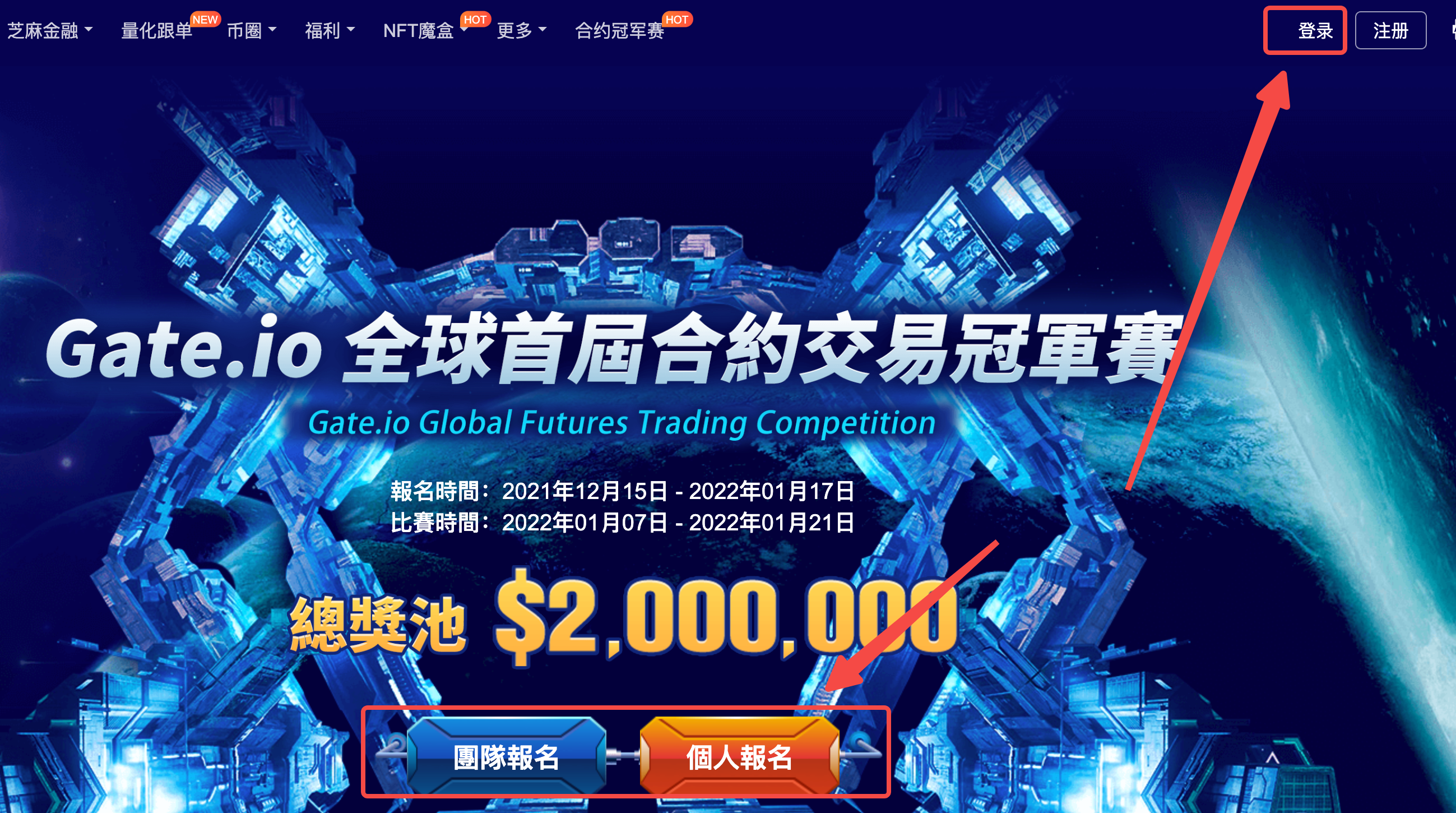 合约交易冠军赛活动页面--登录(页面右上角)--点击“团队报名”或“个人报名”(二选一,不能同时参与)