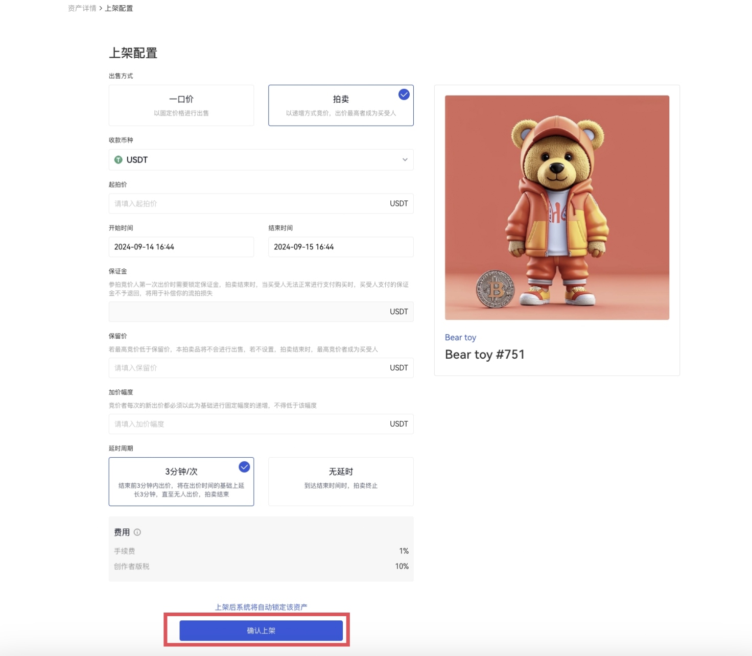 进入该 NFT 资产的上架配置页,找到并点击拍卖出售方式选项,在拍卖出售方式下方确定您的收款币种,从下拉列表中选择您愿意接受付款的加密货币,输入起拍价,并设置资产在架开始时间和结束时间;在保证金下方设置您的保留价,输入加价幅度,并选择延时周期,最后点击「确认上架」按钮即可上架成功;