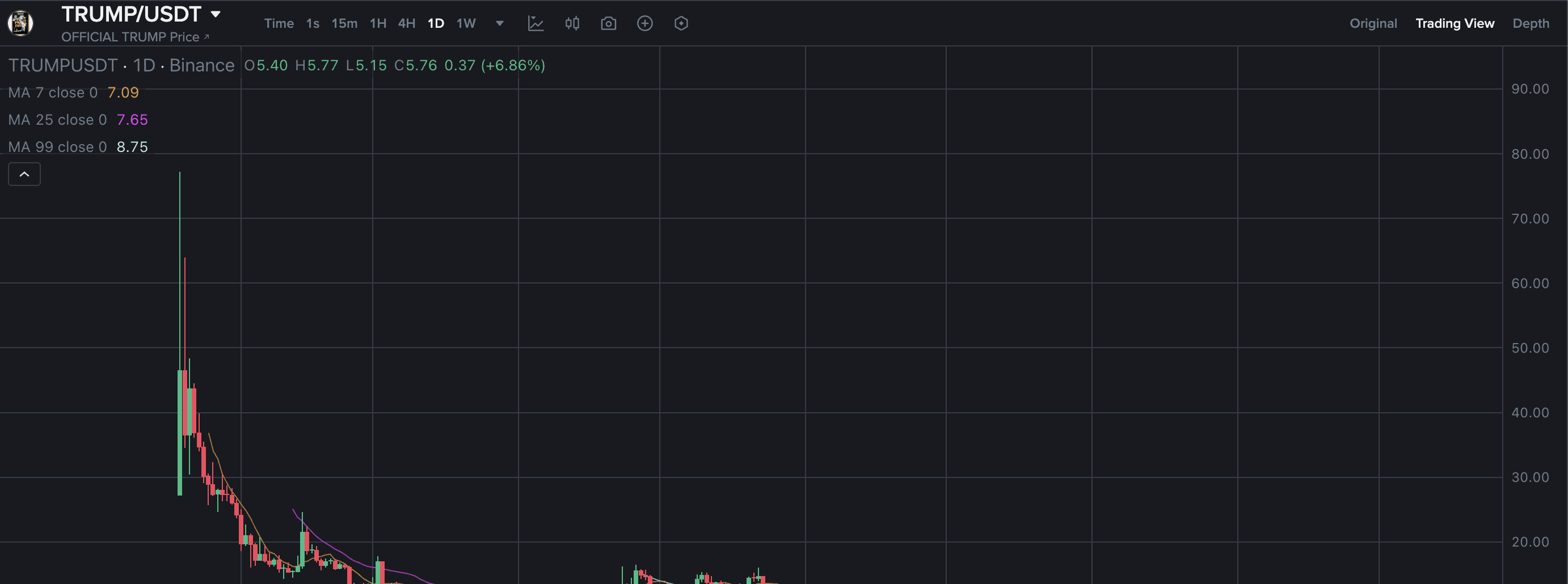$TRUMP 在经历了一次剧烈下跌后,形成了一根强劲的日内反弹蜡烛,目前交易价格为$5.76 (+6.86%)。此次反弹正发生在多个月的需求水平上,暗示着可能的趋势反转或激进的短期反弹。