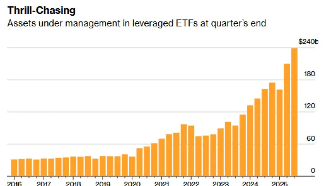 与此同时,股票投资者的投机热情正在飙升,据彭博数据,传统杠杆交易所交易基金(ETFs)在2025年第三季度的管理资产达到了$239 十亿美元的历史新高。