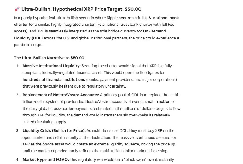 分析师指出,XRP在极度看涨的情况下,可能达到$50 。这一跃升将由多种力量共同推动。根据他们的评估,一旦监管机构解除许多企业面临的不确定性,主要金融机构可能会迅速采用XRP。
