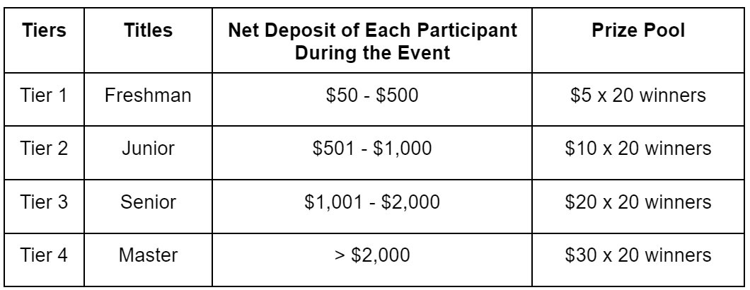 Winners will be selected from each tier based on the ranking of their net deposit during the event. $1,300 to be split: first come, first served.