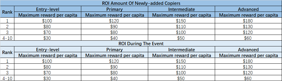 The reward rules are as follows: Traders of different levels can get the corresponding rewards shown in the following figure if they perform well in the [ROI Amount of Newly-added Copiers] and [ROI During The Event].
