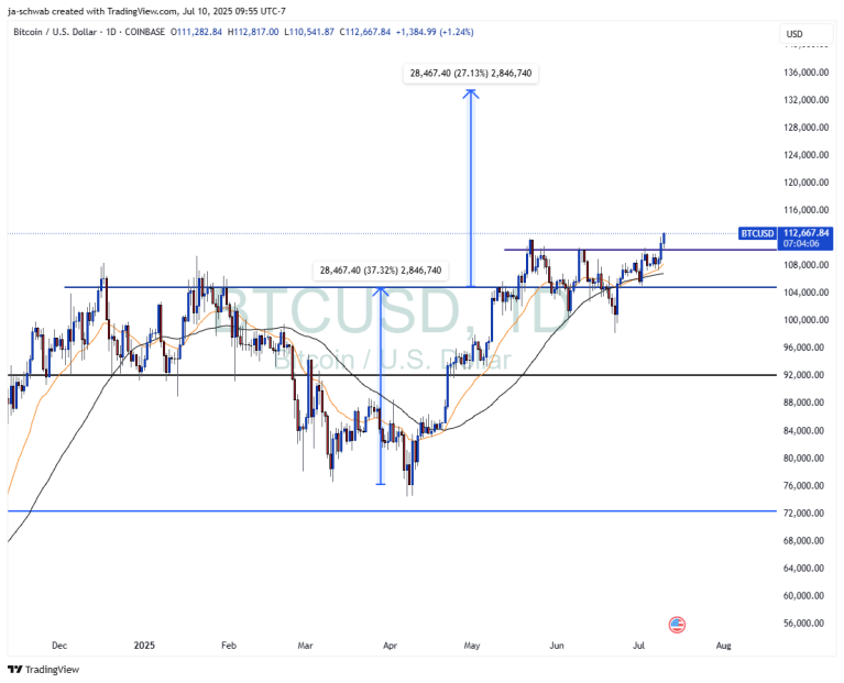 قال JA Schwab إن هذا الهدف ناتج عن الاتجاهات التي تم قياسها. يبدو أن الهيكل قوي، حيث أن سعر تداول BTC أعلى بكثير من متوسطه المتحرك. طالما أن السعر يبقى فوق 108,000 إلى 110,000 دولار، لا يزال المضاربون في وضع السيطرة.