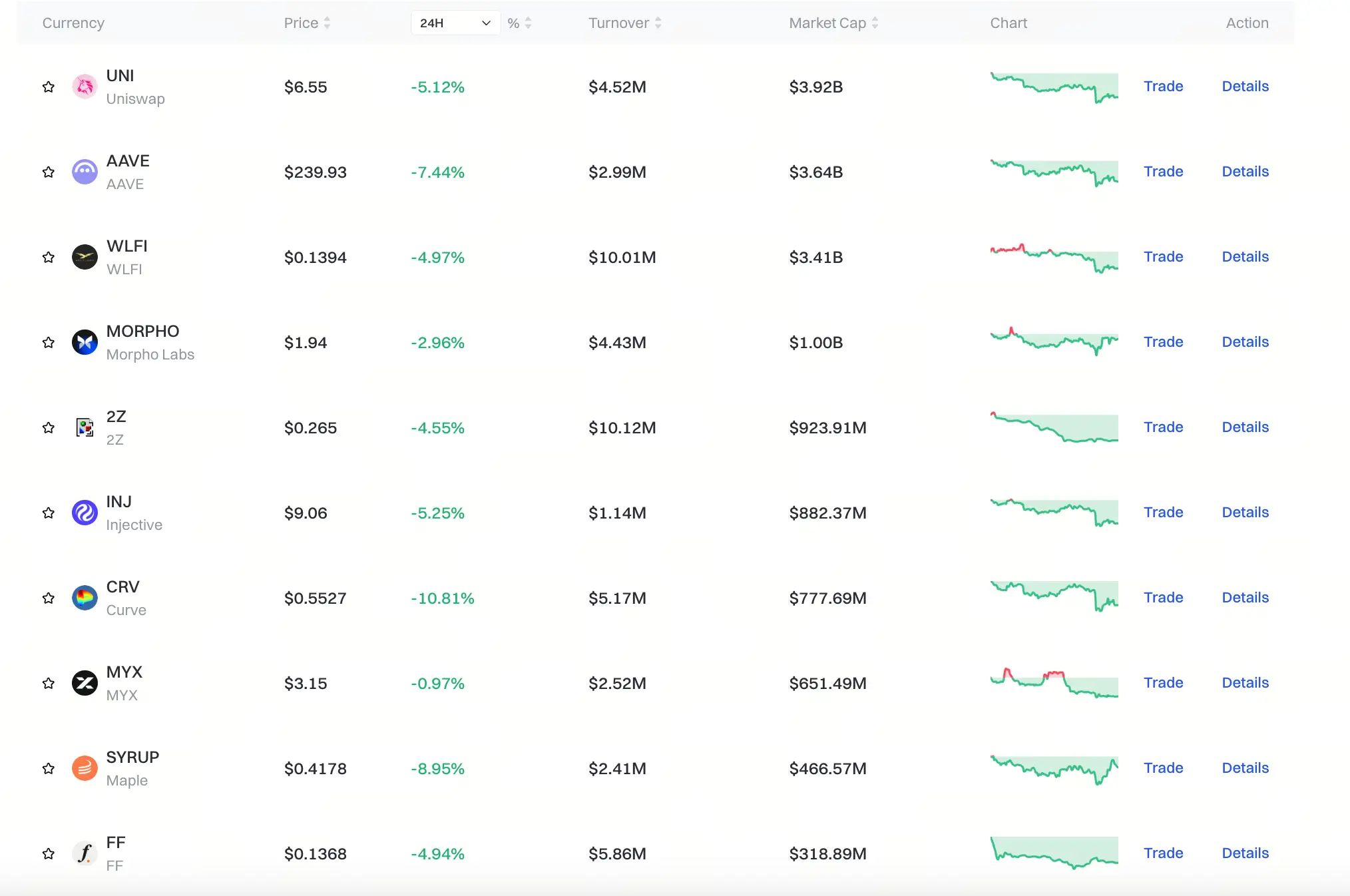 تراجع قسم Gate DeFi بشكل عام، حيث انخفض UNI بنسبة 5.12%، وانخفض AAVE بنسبة 7.44%، وبلغ انخفاض CRV 10.81%، ليصبح من الأصول الرئيسية المتأثرة في هذه الجولة من التعديل. بالمقارنة، كان انخفاض MYX هو الأقل، حيث بلغ 0.97% فقط، مما يظهر أن بعض الأصول الصغيرة القيمة تظهر خصائص مقاومة في مواجهة التقلبات. السوق بشكل عام في مرحلة تصحيح فني، يفتقر إلى دخول أموال جديدة.