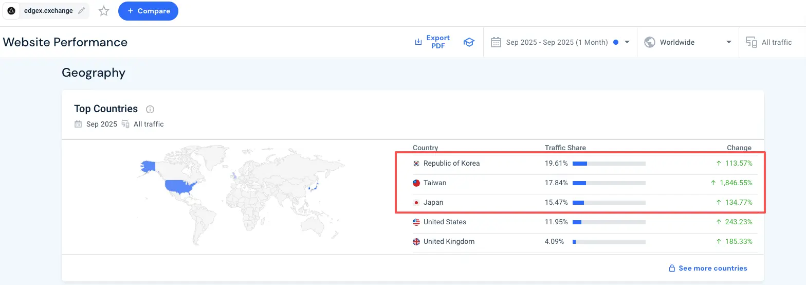 Los datos de acceso web (fuente: similarweb) muestran que Japón, Corea y Taiwán representan la mitad, y hay muchos usuarios en China continental usando VPNs dispersos globalmente. La comunidad indica que la proporción en CN sigue siendo significativa.