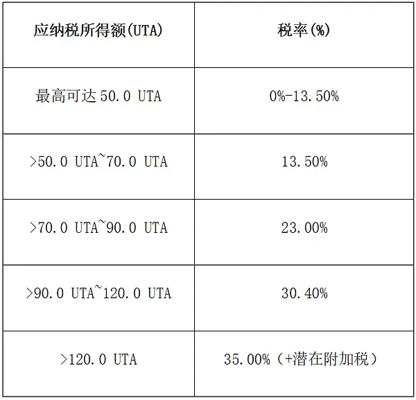 El sistema de impuesto complementario global aplica una tasa impositiva progresiva (impuesto progresivo), con tasas que oscilan entre el 0% y el 40%, siendo las escalas impositivas determinadas en función de la Unidad Tributaria Anual (UTA). Cada año, el SII ajusta el valor de la UTA en función de factores de inflación y tipo de cambio. Las escalas del impuesto sobre la renta personal para el año 2025 son las siguientes: