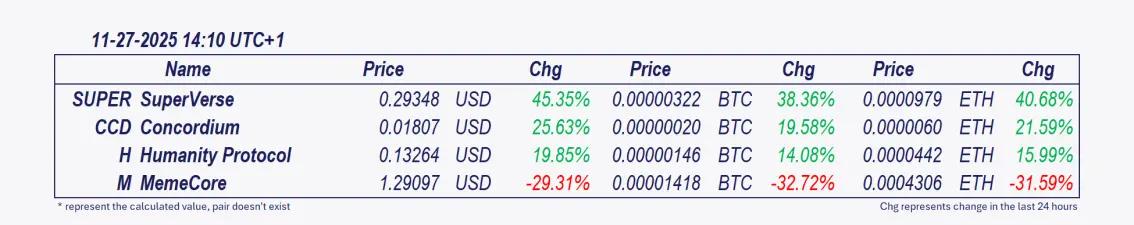 Concordium y SuperVerse: Estas criptomonedas han sido las de mejor rendimiento en las últimas 24 horas, con SuperVerse aumentando un 25.63% desde la actualización de la mañana. 💡El rally de SUPER refleja una combinación de impulso del ecosistema, liquidez impulsada por el intercambio y compras técnicas. Si bien es alcista a corto plazo, la sostenibilidad depende de mantener la demanda impulsada por la utilidad frente al apalancamiento especulativo. Clave a observar: ¿Puede SUPER mantenerse por encima de su SMA de 30 días ($0.285) para confirmar una reversión de tendencia? Monitorear la tracción de asociaciones y el interés abierto en derivados para obtener pistas direccionales.