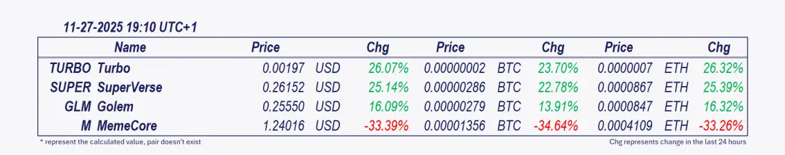 SuperVers y Turbo: Estas criptomonedas han sido las de mejor rendimiento en las últimas 24 horas, con Turbo registrando la ganancia intradía más significativa desde la medianoche, disparándose un 32.42%. 💡El rally de Turbo combina disparadores técnicos, hype mediático y especulación impulsada por la comunidad—un patrón familiar en las monedas meme volátiles. Aunque hay señales alcistas presentes, la alta tasa de rotación del token (0.531) sugiere que la liquidez delgada podría magnificar los riesgos a la baja si el sentimiento cambia. Punto clave a observar: ¿Puede TURBO mantenerse por encima de $0.00192 (50% Fib) en un volumen decreciente, o la toma de ganancias revertirá las ganancias?