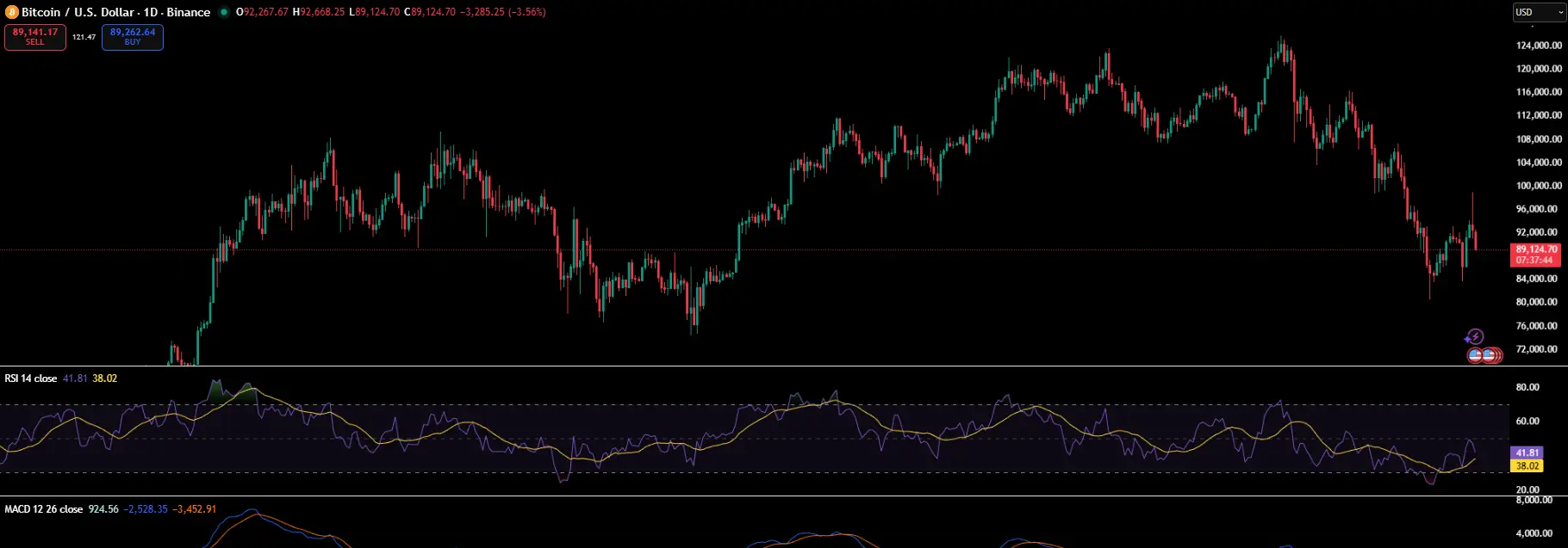 Los datos de TradingView muestran una continuación de la presión bajista, con el Bitcoin formando máximos y mínimos más bajos, una estructura bajista de manual que sugiere que los vendedores siguen teniendo el control.