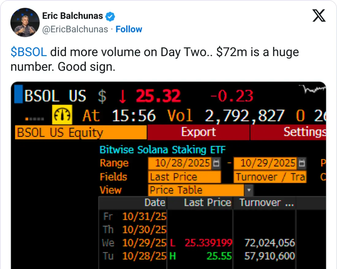 Pendant ce temps, le Bitwise Solana Staking ETF (BSOL) a terminé sa deuxième journée de négociation mercredi avec plus de $72 millions de volume de négociation.