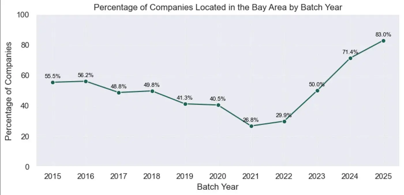 1. Fokus di Wilayah Teluk San Francisco: Proporisi pendiri YC yang berkantor pusat di wilayah teluk bahkan lebih tinggi daripada tingkat sebelum pandemi, kini mencapai 83%