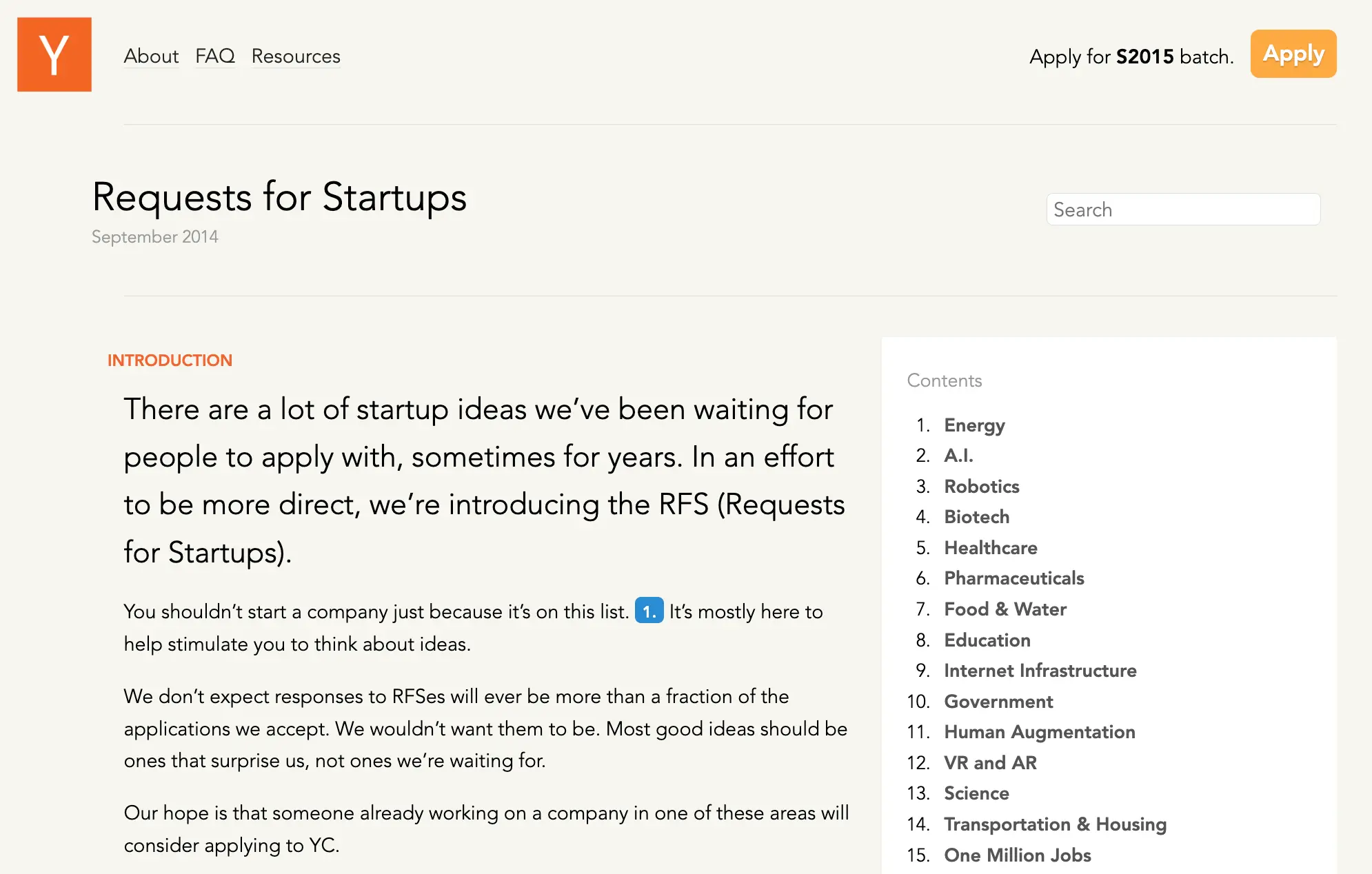 Saya tidak ingin hanya berwirausaha untuk berwirausaha, saya berharap itu bisa lebih bermakna, untuk menemukan masalah yang layak diselesaikan. Dalam mencari masalah yang bermakna, saya secara kebetulan menemukan daftar RFS Y Combinator (YC), yaitu “Permohonan Proposal Kewirausahaan”.