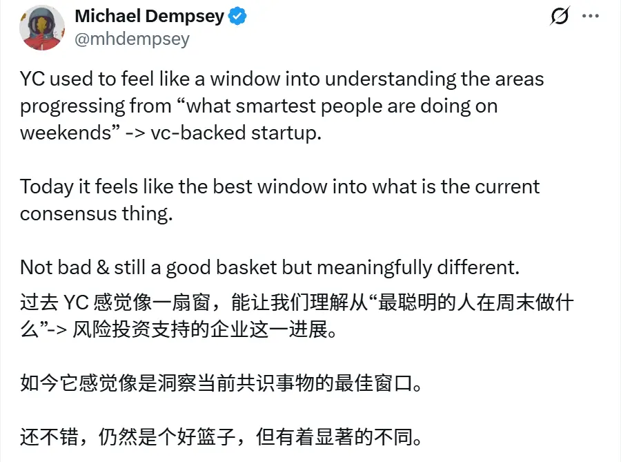 Ini adalah komentar Dempsey. YC sedang menjadi “jendela terbaik untuk melihat konsensus arus utama saat ini.”