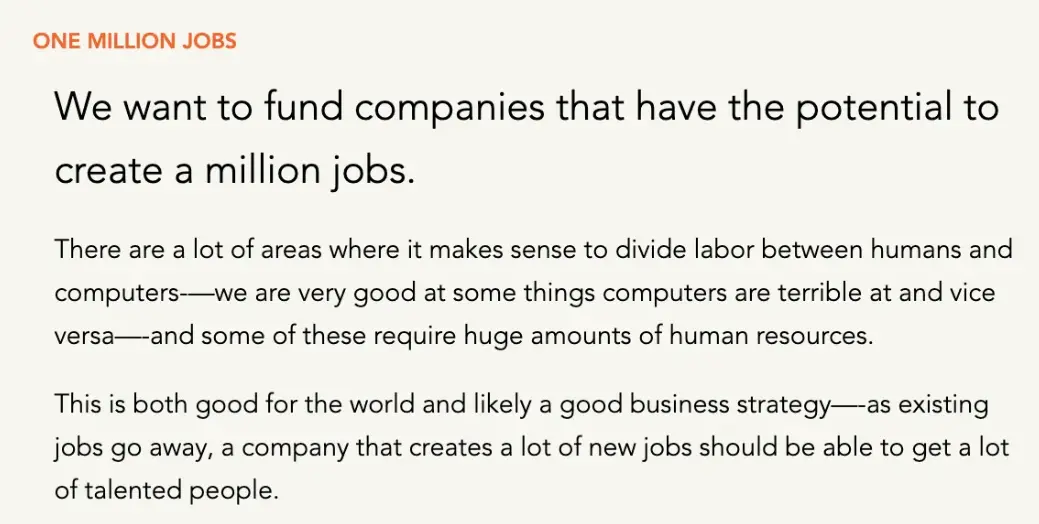 Kembali ke tahun 2014, saya ingat bahwa entri YC tentang “satu juta pekerjaan” sangat mengejutkan saya: sejak saat itu, saya sering berpikir, apakah benar di AS hanya Walmart (dan kemudian Amazon) yang mempekerjakan satu juta orang. Ini sangat sulit dilakukan! Di dunia di mana kesempatan kerja semakin menghilang, petunjuk ini bertujuan untuk mengeksplorasi jenis model bisnis apa yang dapat mempekerjakan satu juta orang. Ini sangat menggugah pemikiran!