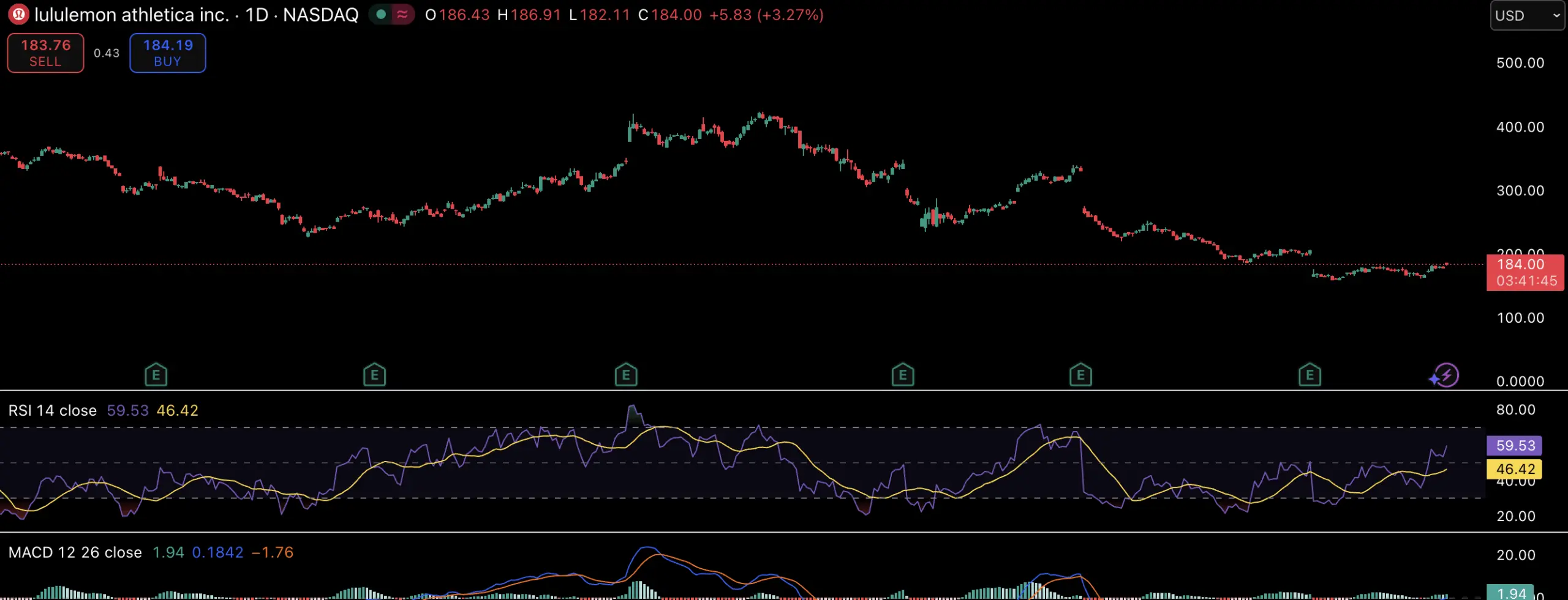 Dari sudut pandang teknis, saham LULU menunjukkan tanda-tanda awal pemulihan setelah berbulan-bulan berkinerja buruk. Saham ini telah bangkit dari titik terendah dekat $160 dan sekarang sedang menguji resistensi di sekitar $185. Indeks Kekuatan Relatif (RSI) berada di 59,5, menunjukkan momentum yang membaik tanpa mencapai level overbought, sementara indikator MACD baru saja melintasi ke wilayah positif, mengisyaratkan potensi untuk kenaikan lebih lanjut.