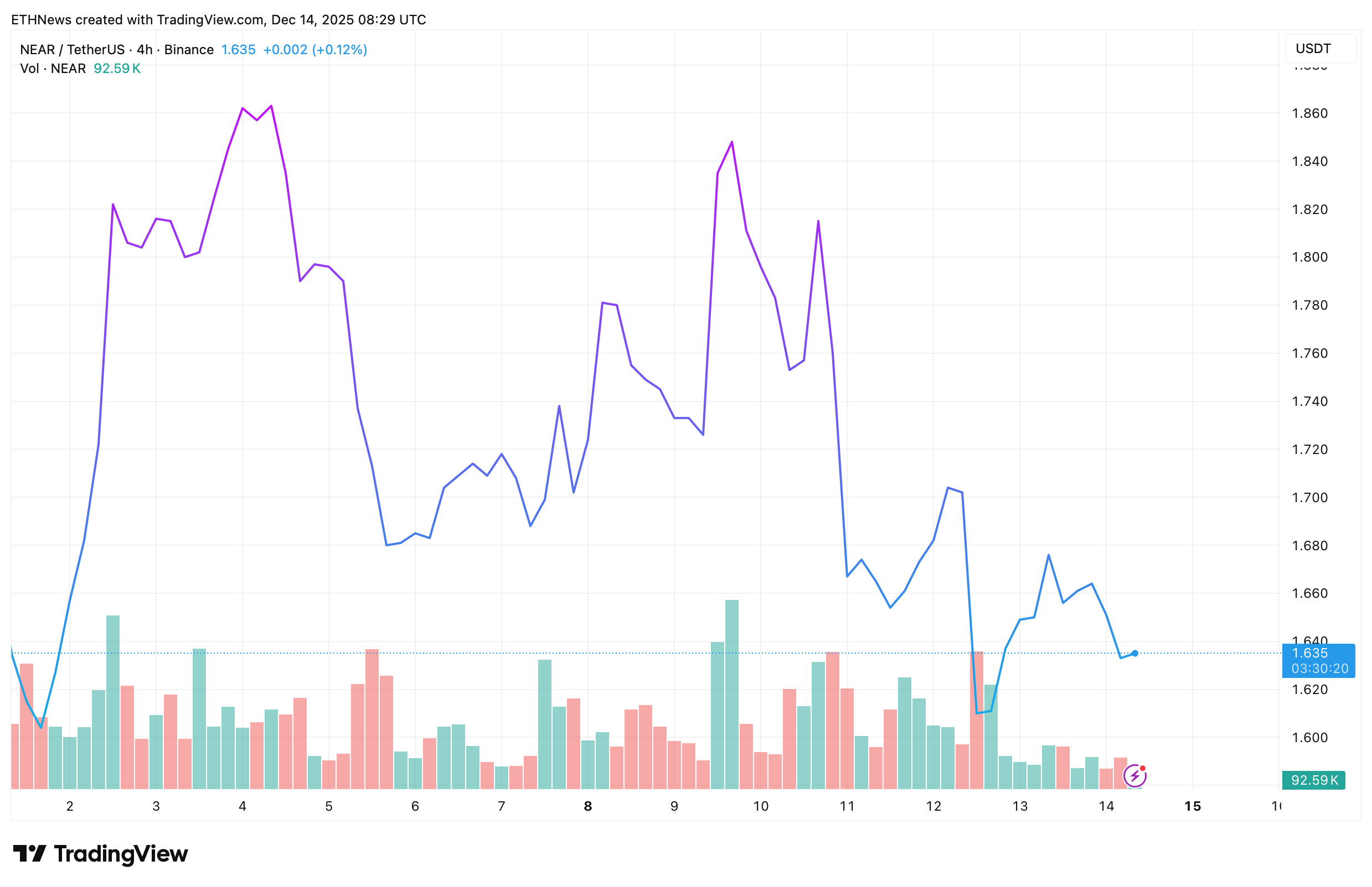 Grafik TradingView dari NEAR/USDT memperkuat narasi ini. Aksi harga terbaru menunjukkan serangkaian wick tajam ke resistance dan volatilitas lebih tinggi di sekitar zona $1,60–$1,70, tetapi tidak ada penurunan di bawah support. Meskipun terdapat puncak yang lebih rendah pada grafik 4 jam, struktur yang mendasarinya menunjukkan bahwa pembeli secara konsisten masuk untuk mempertahankan rentang. Konsolidasi ini konsisten dengan harapan analis bahwa token sedang mempersiapkan pergeseran setelah momentum kembali.