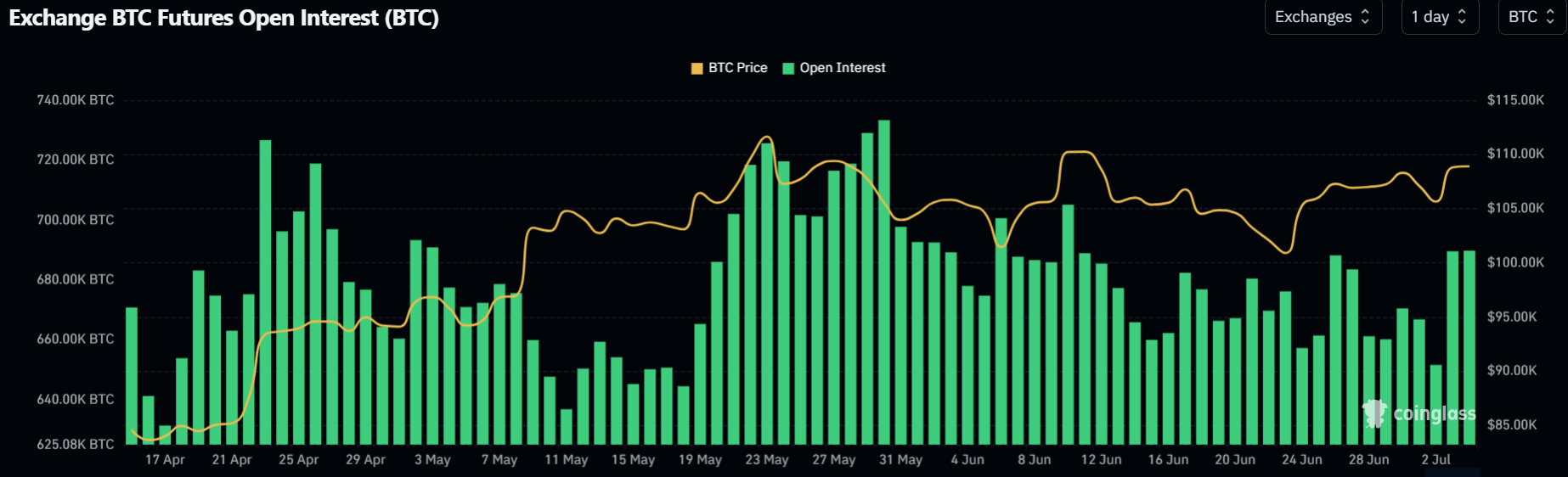 この進展はビットコインのポンプを引き起こし、過去24時間でこのトップ暗号資産は3%上昇しました。Coinglassのデータによると、この上昇はビットコインを10.9万ドル以上に押し上げ、111,970万ドルの歴史的高値をわずかに下回り、先物の建玉(OI)は65.166万枚のビットコインから68.978万枚のビットコインに増加しました。建玉とは、デリバティブ市場における未決済契約の総価値を指します。