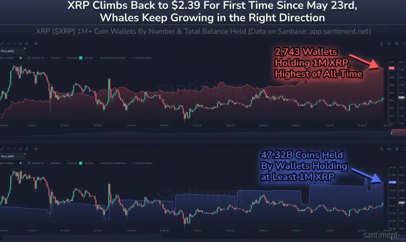さらに、Equities Tracker の Nick と Santiment の Brian からの最近の洞察は、XRP の ファンダメンタルズ が着実に強化されている兆候を示しています。彼らは、100 万枚以上の XRP を保有する ウォレットアドレスの数 が記録的な 2,743 個 に急増したことを指摘しています —— これは間違いなく 暗号資産のクジラ活動 の増加と XRP の大規模な蓄積 行動の増加を示す明確なサインです。