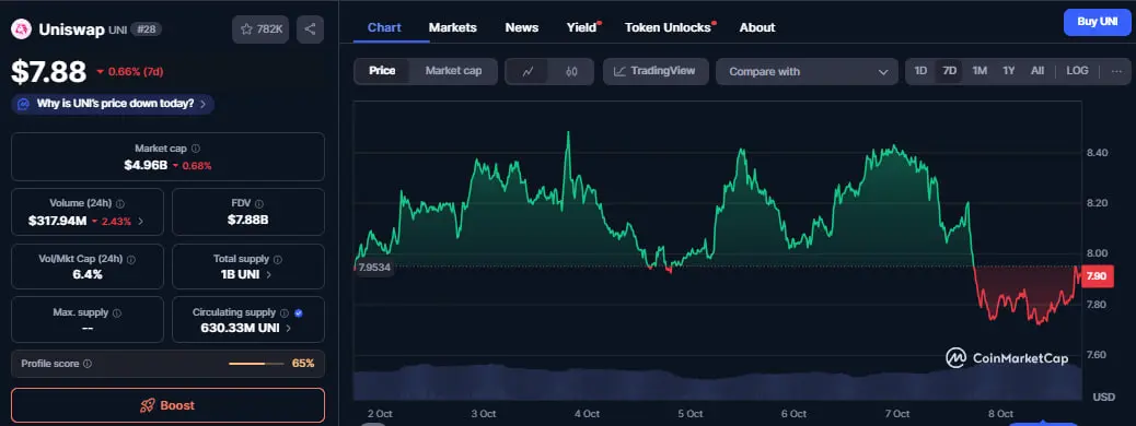 UNIは先月の価値のほぼ20%を失った後、$7.88で取引されています。