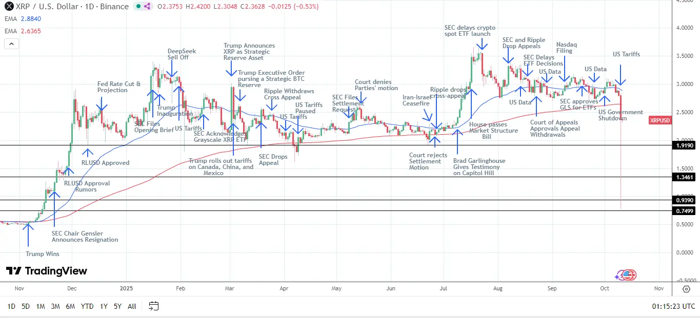アメリカ政府の閉鎖と最新の関税発表により、XRPの価格は3.1027ドル(10月2日)から2.3628ドル(10月11日)へ大きな下落をし、下落幅は24%に達しました。アナリストは、XRP現物ETFの発売後に新たな高値を記録すると予測しています。
