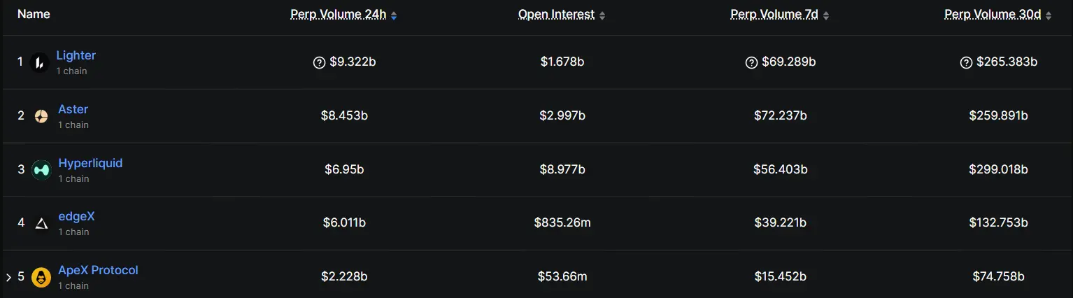 Hyperliquidは2990億USDで首位を占め、次いでLighter (265.4億USD)とAster (259.9億USD)が続きます。この成長は、トレーダーがより透明性のあるDEX、低い手数料、直接的な資産管理を求めて集中取引所(CEX)を離れていることを反映しています。現在、DEXは全世界の取引量の20%以上を占めており、昨年の10%未満から大幅に増加しています。