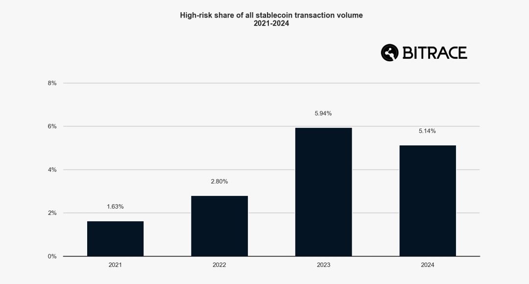 取引量に基づいて計算すると、この高リスク活動はその年のステーブルコインの総取引活動の5.14%を占め、2023年と比較して0.80%減少しましたが、2021年および2022年よりも依然として顕著に高いです。