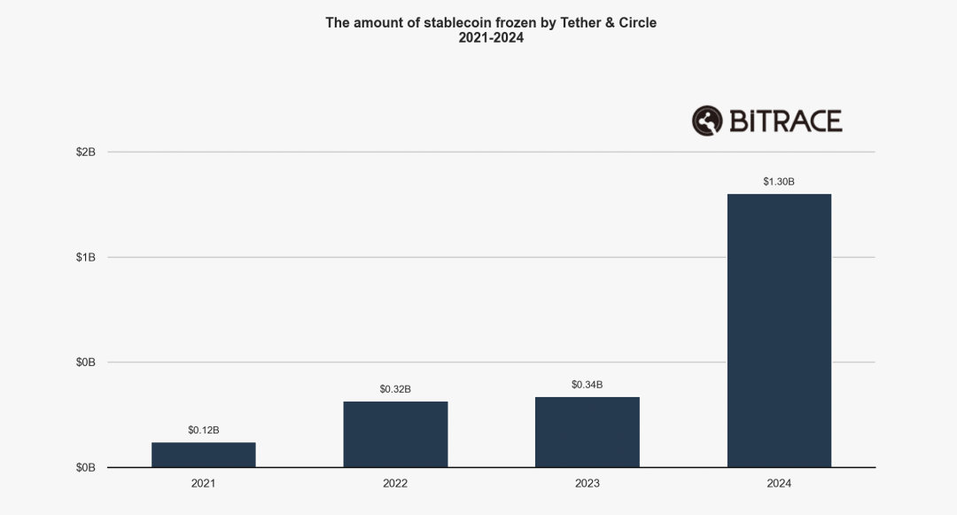 2024年はステーブルコイン発行者たちが積極的に法執行に協力する年であり、テザー(Tether)とサークル(Circle)社は共にイーサリアムおよびトロンネットワークで13億ドルを超えるステーブルコインを凍結しました。これは過去3年間の凍結規模の2倍です。