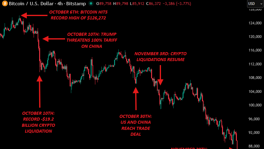 The Kobeissi Letterの新しい分析によると、ターニングポイントは10月10日、地政学的な緊張が関税の発表を引き起こし、1日で過去最大の暗号清算である192億ドルと一致したときに訪れました。