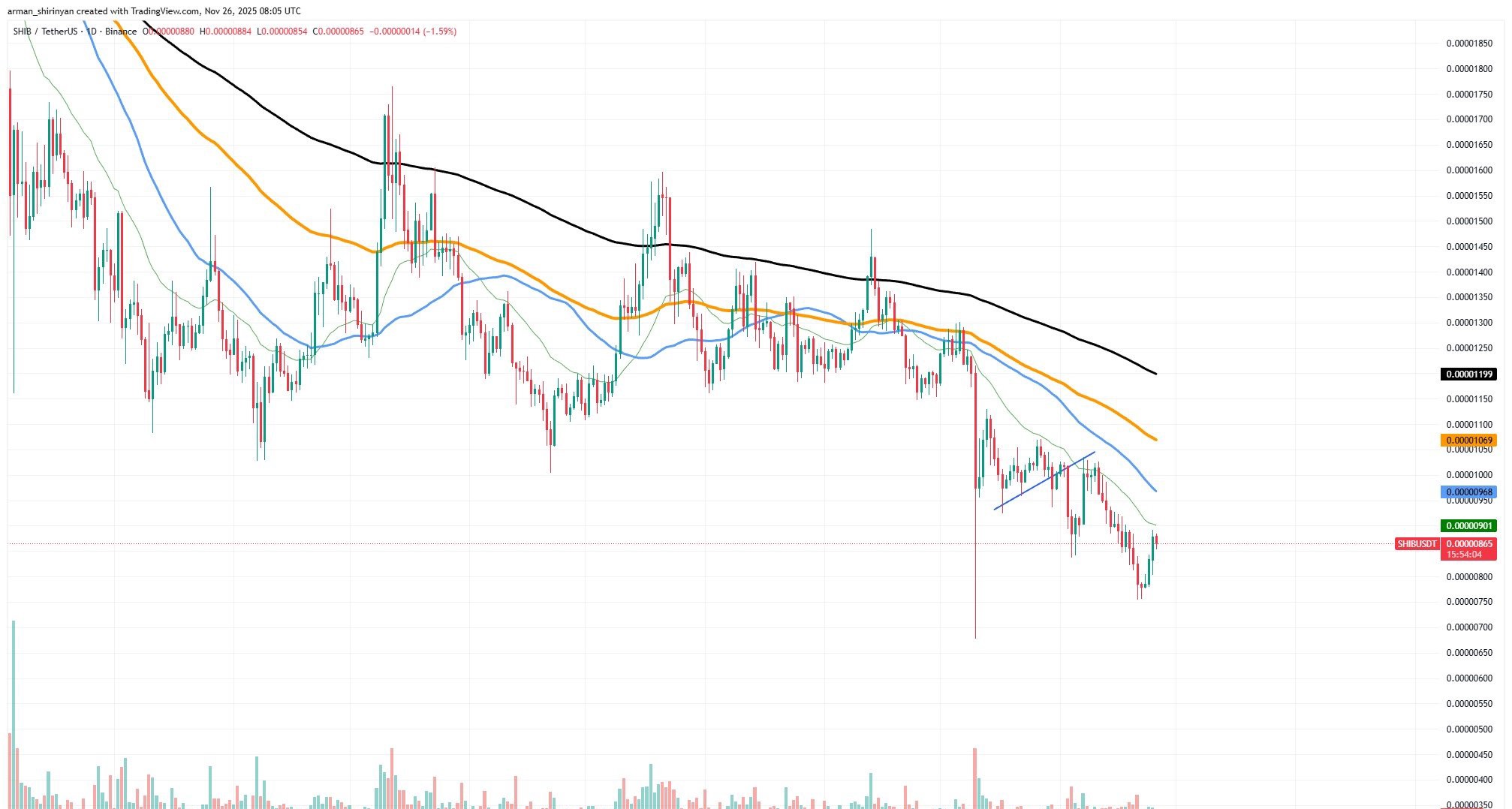 SHIBの価格は現在、20日EMAのテストに近づいており、価格がこのレベルを超えると、最初の重要なトレンドの変化が起こる可能性があります。インジケーターは現在、$0.0000091-$0.0000093の範囲にあります。